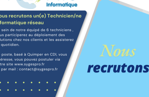 Pour renforcer l’équipe, SYGESPRO Informatique recherche un(e) technicien(ne) assistance informatique et réseau qui sera rattaché(e) au siège de Quimper. Vos missions Déployer et maintenir les solutions vendues chez le client Intervention, en physique ou à distance, sur l’équipement d’un utilisateur...